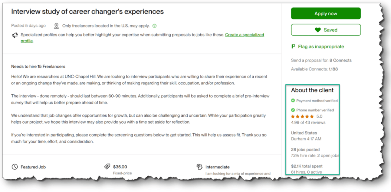 This is a job we can all relate to: just a short interview on career transitions by researchers at University of North Carolina. Using this job as an example, Heidi outlined how to evaluate Upwork clients by verifying payment methods, hire rates, and feedback.Ā