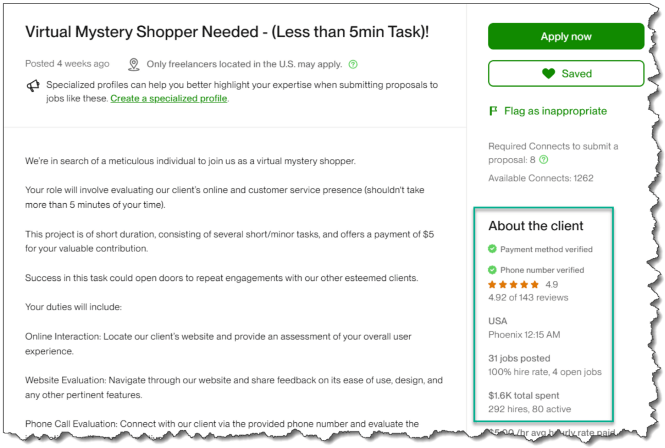 Look for clients with verified payment methods, high ratings, and a strong hire history like this weekās example: 100% hire rate and 292 past hires.Ā