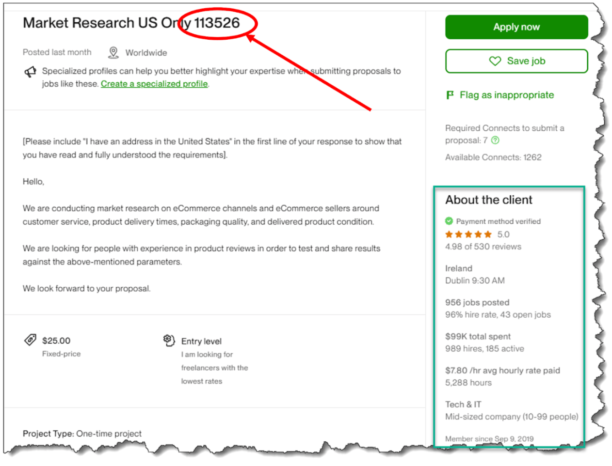 One key takeaway: Follow the instructions exactly. This client specifically asks for “I have an address in the United States” as the first line of your proposal—don’t bury it elsewhere! Freelancers who miss small details like this often lose out before their proposal even gets read!