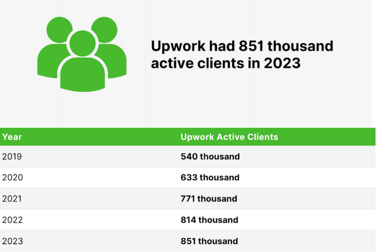 Upwork had 851 thousand active clients in 2023. That’s a 4.55% increase from 814 thousand in 2022.